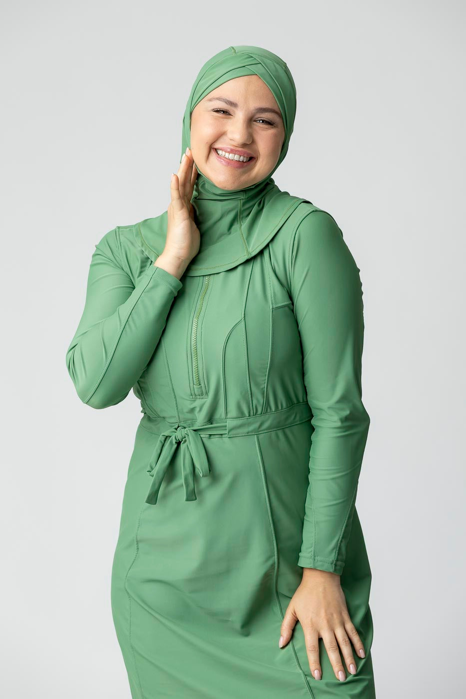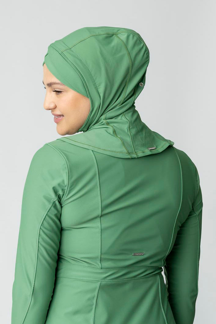 Featuring a sleek criss-cross design around the forehead, this swim hijab is as stylish as it is functional. The contoured fit enhances your look while ensuring the hijab stays put, no matter how active you are. No pins, no adjustments—just a secure, elegant design that moves with you.